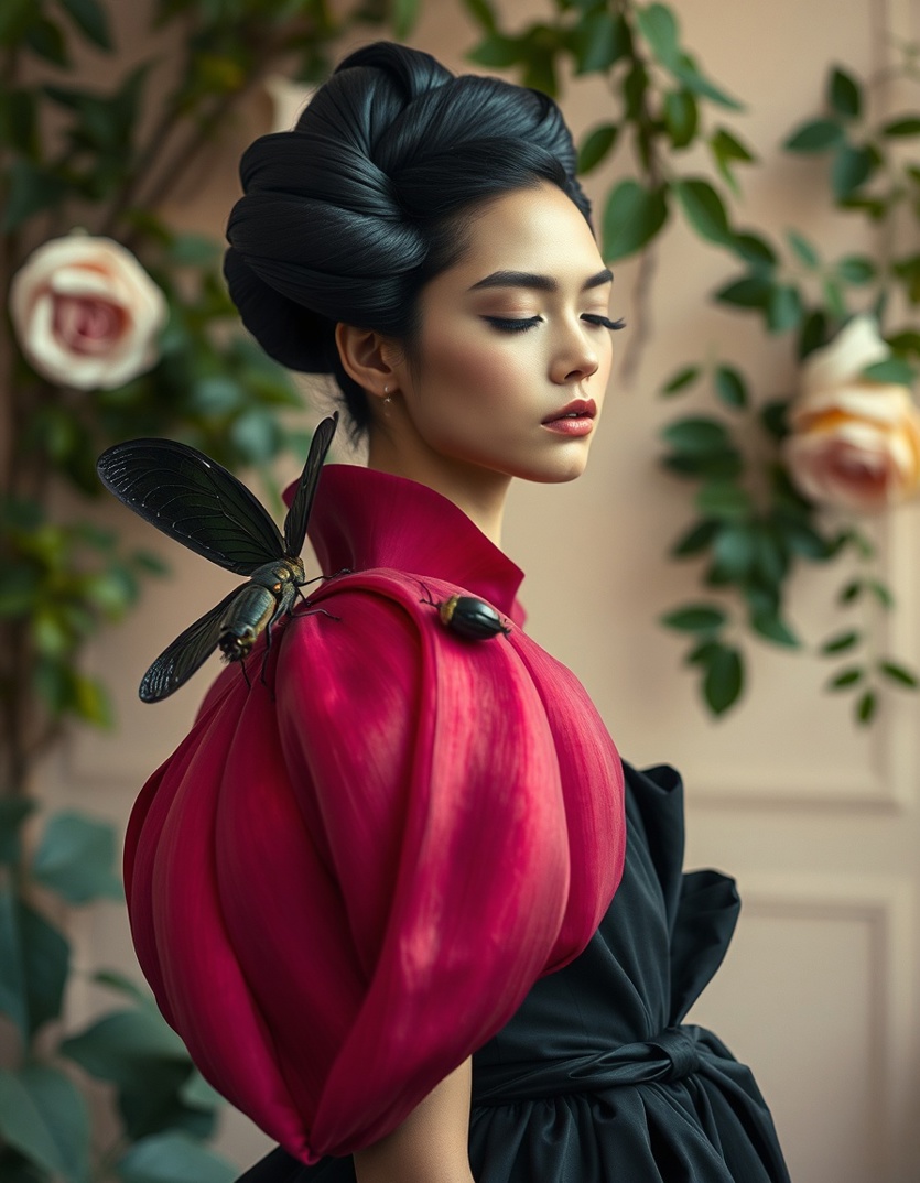 Editorial fashion photograph in the ethereal, dreamlike style of Tim Walker, capturing a young Silent Sorceress with vibrant Raven Black hair styled into an elaborate Sculptural Twist, her eyes gently closed in a peaceful reverie as she wears a surreal haute couture gown creatively constructed from the giant petals of a Black Tulip, with a colossal, hyper-realistic Damselfly fused into the garment's shoulder as a living epaulet against a soft-focus studio backdrop of lush foliage and a pale rose wall.